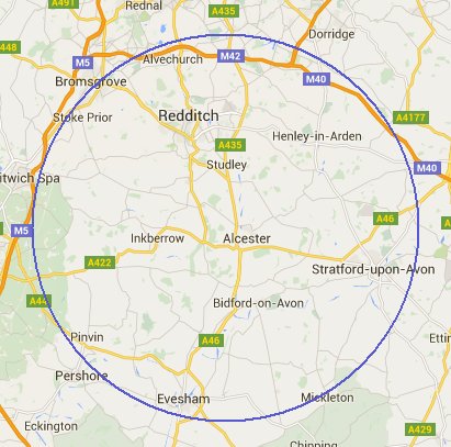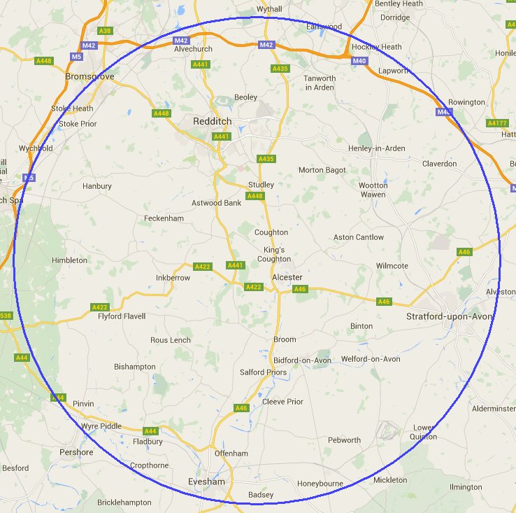 Alcester, Tanworth in Arden, Henley-in-Arden, Claverdon, Stratford-Upon-Avon, Bidford-on-Avon, Welford-on-Avon, Honeybourne, Evesham, The Lenches, Inkberrow, Feckenham, Hanbury, South East Bromsgrove, Alvechurch and Redditch.